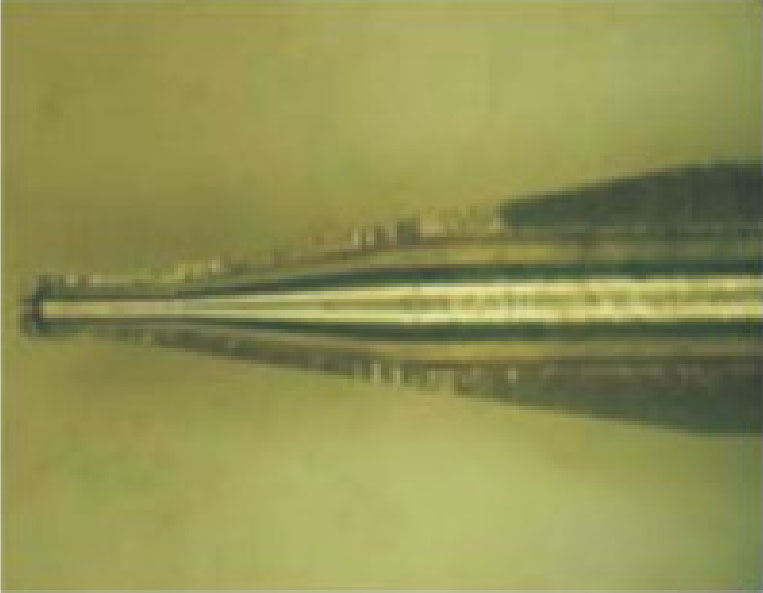 - 適用于點膠范圍較為狹窄的針頭,為了避免點膠時與 器件內(nèi)部碰撞,不改變針頭內(nèi)徑,將外徑縮小。一般 的針頭前端壁厚是50μm,細針頭最小可做到25μm, 能有效解決狹窄空間點膠難問題。